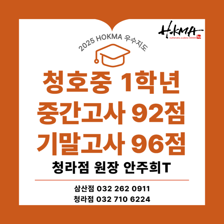 안녕하세요. 청라 수학학원, 호크마수학학원입니다. 오늘은 중간고사 92점에 이어, 기말고사에서 96점을 받은 청호중학교 1학년 이OO 학생의 이야기를 들려드리려고 합니다. 스스로 수학을 못한다고 생각하며 항상 자신감이 부족했던 학생이 어떻게 시험을 거듭할수록 더 높은 성적을 만들어낼 수 있었을까요? 청라 수학학원 호크마 안주희 원장 선생님의 중1 우수지도 사례, 함께 살펴보겠습니다. Problem 청호중학교 1학년 이OO 학생은 청라 수학학원 호크마에 오기 전, 공부방에서 자습 위주로 수학 공부를 해왔습니다. 초등학교 때 성적은 나쁘지 않았지만 문제를 깊이 고민해 보는 경험이 부족했고, 무엇보다 스스로를 "수학 못하는 학....... <img src="https://blogthumb.pstatic.net/MjAyNjAxMTZfMjEw/MDAxNzY4NTY5NDU2MTAz.CMBh51utwzAi3WAOuVe_xKnMEUF0HEmyNmXa9v1qPtYg.jP3xVKBh_1qsx07JgIUOc2IBWcKQZHpK9Zuh5esQDaIg.PNG/%C3%BB%C8%A3%C1%DF_1%C7%D0%B3%E2_2%C7%D0%B1%E2_%B1%E2%B8%BB_96%C1%A1_%BB%E7%B7%CA_%BE%C8%C1%D6%C8%F1t-001.png?type=s3" />