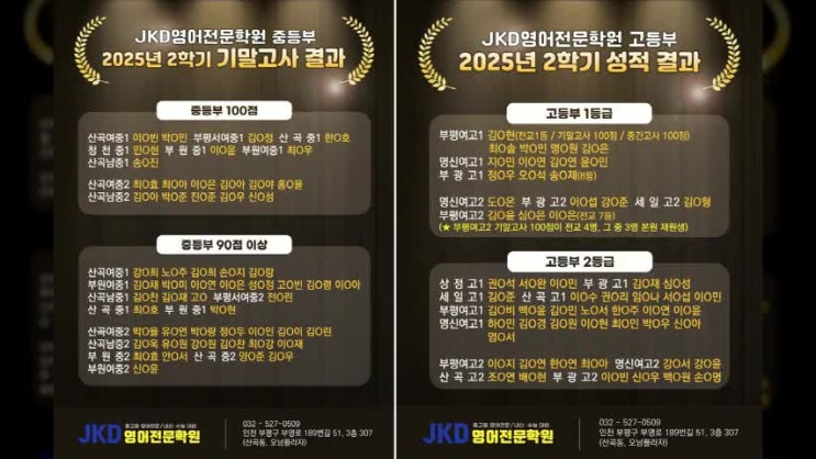 부평 영어학원 명가 산곡동 JKD영어전문학원 재원생 25년 2학기 성적