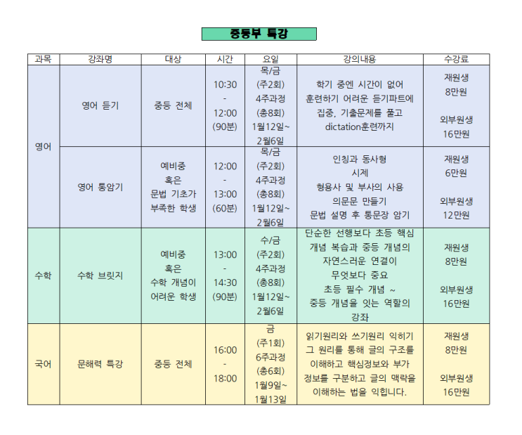 2026 계양구 국영수 학원 겨울방학 중등특강 한눈에 보기