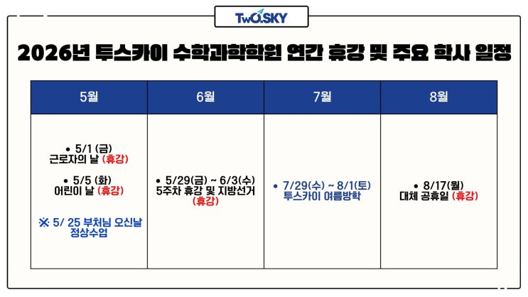 안녕하세요! 학생 스스로 생각하는 힘을 기르고, 문제 해결의 본질을 꿰뚫는 학습을 지향하는 청라 투스카이 수학과학학원입니다. 벌써 한 학기의 반환점을 도는 5월이 다가오고 있습니다. 우리 아이들이 지치지 않고 꾸준히 학습 루틴을 이어갈 수 있도록, 투스카이에서는 5월부터 8월 여름방학까지의 연간 주요 학사 일정을 미리 공유해 드립니다. 가정 내 행사 및 여행 계획을 세우실 때 참고하시어, 아이들의 학습 공백이 최소화될 수 있도록 확인 부탁드립니다. 1. 2026년 5월~8월 투스카이 연간 휴강 및 학사 일정 투스카이는 효율적인 학습을 위해 법정 공휴일 및 5주차 휴강일을 전략적으로 운영하고 있습니다. 특히 고등부의 경우....... <img src="https://blogthumb.pstatic.net/MjAyNjA0MTRfMjEy/MDAxNzc2MTUxNjA1MjEx.EU4KnwOBozbWwvlIqjq7j6Piku_PGEoAw_ZSjSadzaYg.PIw9ksA3837ZLa0HUbO-91jDJrDN4Ei37B1BICz5YF8g.JPEG/%C1%A6%B8%F1%C0%BB_%C0%D4%B7%C2%C7%D8%C1%D6%BC%BC%BF%E4.-_%BA%B9%BB%E7%BA%BB_%285%29_-_%281%29.jpg?type=s3" />