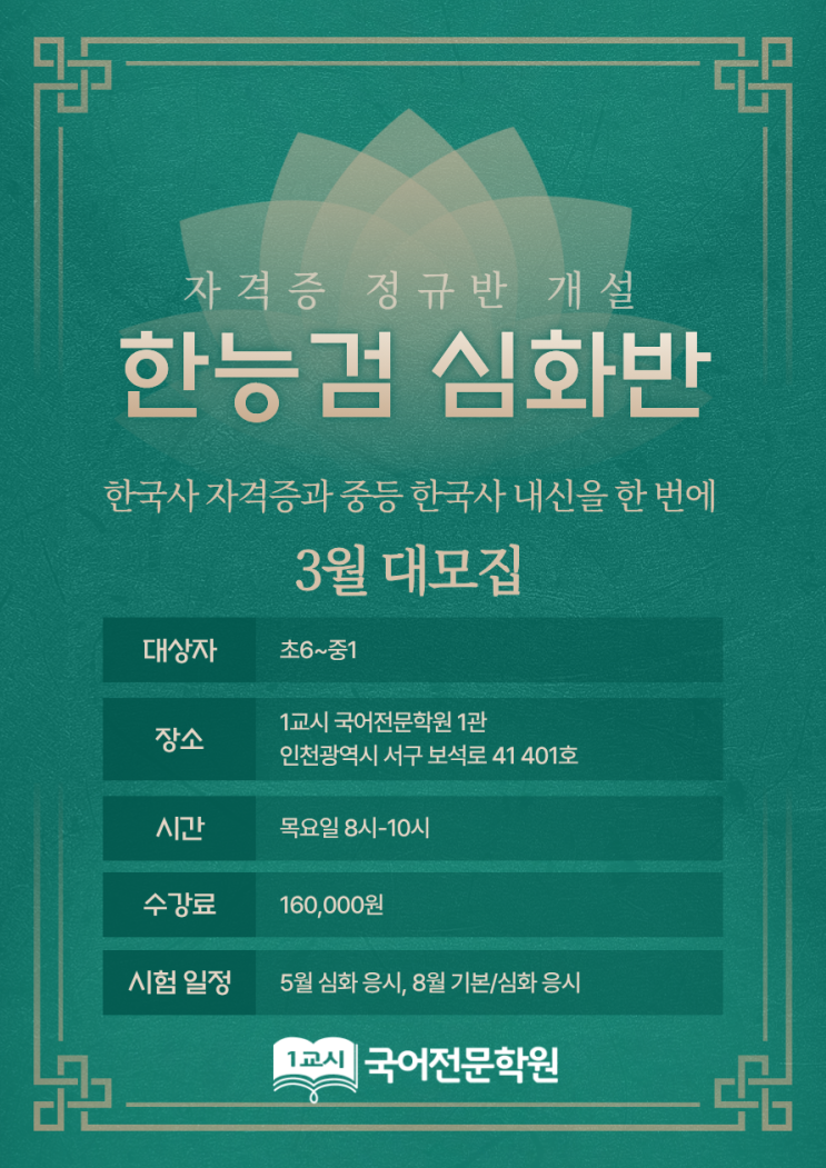 안녕하세요! 1교시 국어학원 사회부입니다. 겨울 특강에만 있었던 한국사능력 검정시험반! 문의가 많아 정규 심화반을 오픈했습니다^^ 한국사능력검정시험이란 무엇일까요? 한국사는 중등 과정부터 필수 과목으로 지정되고, 고등 수능 및 모의고사에서도 필수로 다루어지기 때문에, 초등 시기에 미리 체계를 잡는 것이 정말 중요합니다. 역사 학습의 기초는 흐름을 기억하는 것이며, 초등 시기에 대비해야 오래 기억할 수 있습니다. 그렇다면 한국사, 기본과 심화는 무슨 차이일까요? 이번 정규반은 다가올 5월과 8월 시험을 대비합니다. 심화반인 만큼, 꼼꼼하게 대비하는 것이 관건! 전체적인 흐름을 파악하며 기출 문제를 초정밀 해설합니다! ....... <img src="https://blogthumb.pstatic.net/MjAyNjAzMDNfNzMg/MDAxNzcyNTM4ODM4MzE4.hnFfUi6PeI1IuSNOAaI914j-UsGoMGjiT2knGdwRWdYg.0mapBFK__h6Hq9o17ea5vVzWdcxgynjI2Nf1P6bc40cg.PNG/%C7%D1%B4%C9%B0%CB_%C8%AB%BA%B8.png?type=s3" />