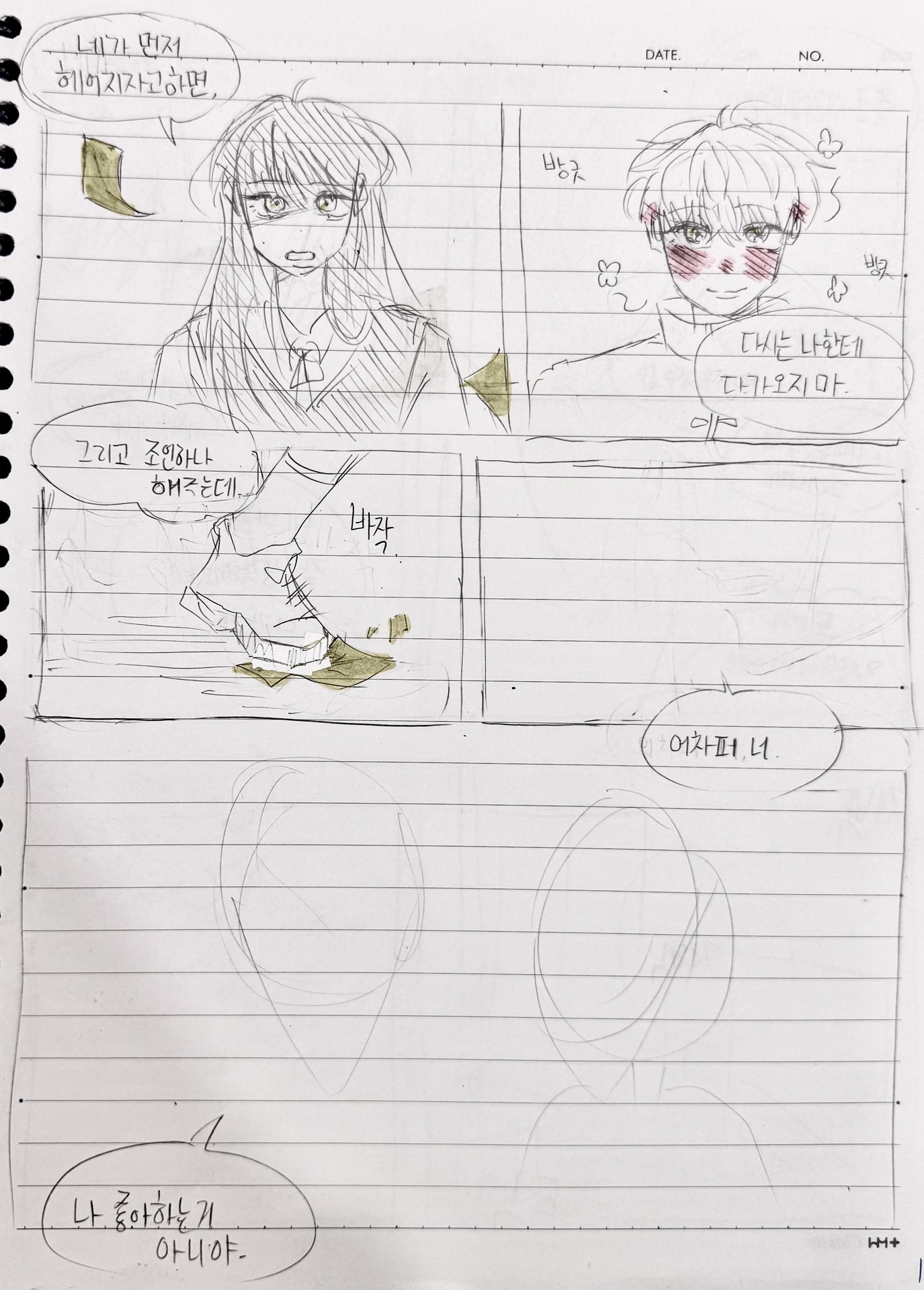 디지털하고 다르게 손그림은 좀 마음이 편해서 하루만에 공장처럼 이만큼 찍어냈어요… 학교가고 학원가고 다하면서…그래서 스토리 매우 망함 손그림 처음 올리니까 걱정되네요. 보정도 여럿 했는데 글씨도 별로 안예뻐서…못 알아보기는 글씨 댓주세요 적어드립니다. 즐감하세요. (중간에 미완성 콘티 있음)