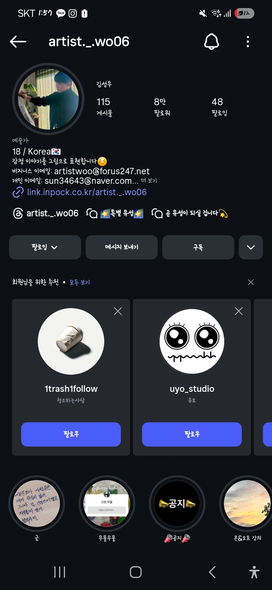 인스타에서 19살이신 분이 그림 늦게 시작했다면서막 자기 얘기하시고 자기 작품 보여주신 분이었구.. 지금은 아마 20살이실 거고 키 작으시다고 라이브에서 본인 입으로 말하셨고 아 라이브에서 기타 치신 것도 봤음.. 내가 위에 적은 릴스에선 긴 머리셨는데 라이브 봤을 때 동글동글 짧게 자르셨었어. 남자셔.