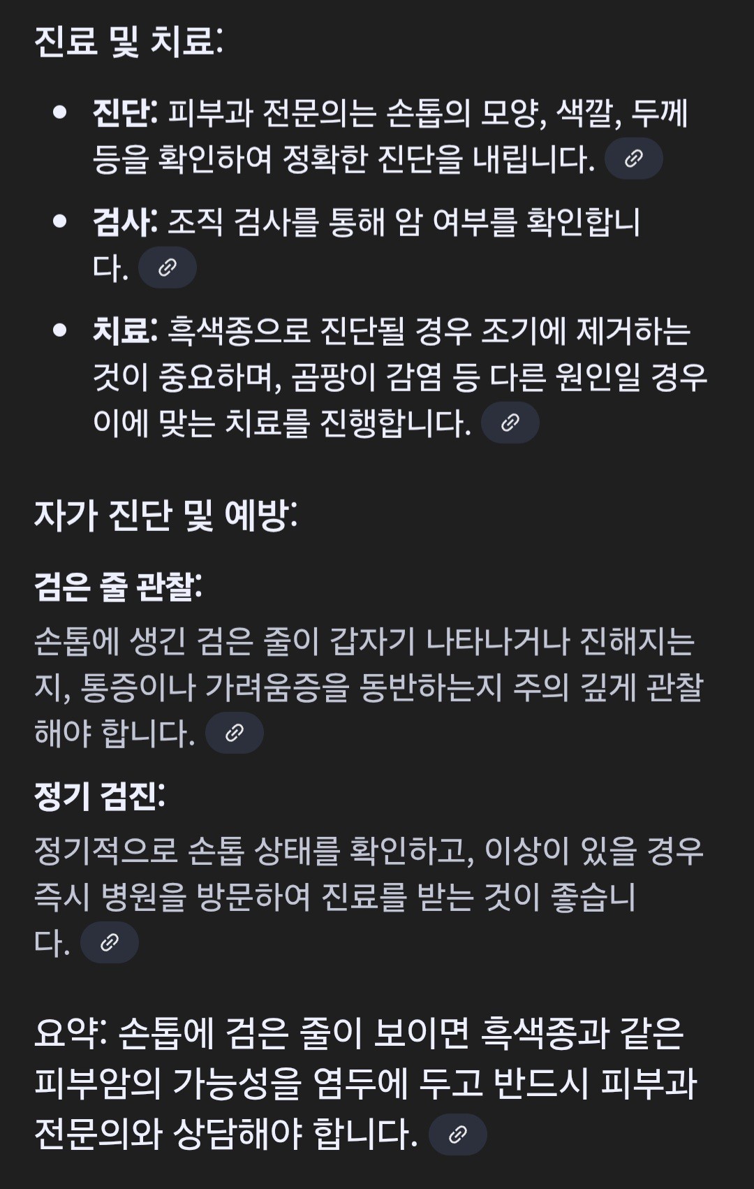 결론적으로, 2년 동안 크기·색이 거의 변하지 않았다면 대체로 양성일 가능성이 높지만, 줄이 두꺼워지거나 색이 퍼질 경우를 대비해 주기적으로 살펴보고 조금이라도 이상하면 피부과 진료로 확진을 받는 게 안전해.