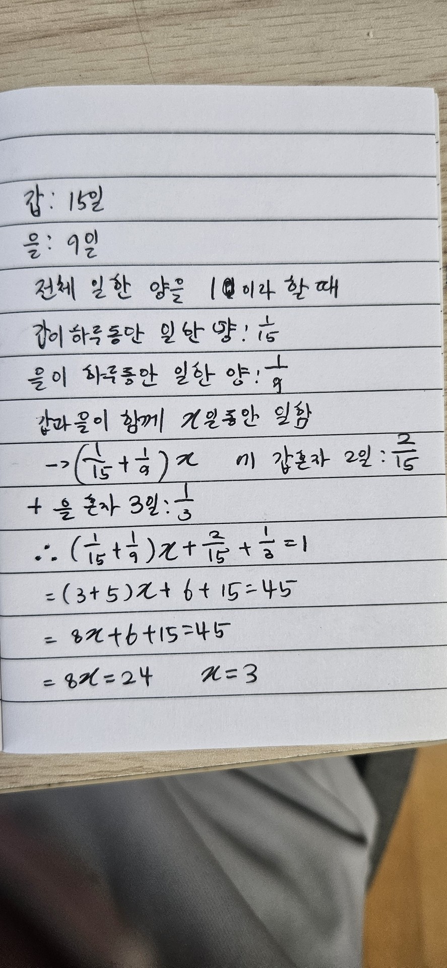 1. 어떤 일을 혼자 한다면 갑은 15일, 을은 9일이 걸립 니다. 이 일을 갑과 을이 함께 며칠 동안 일하다가, 다시 갑 혼자 2일 동안 일을 했습니다. 나머지는 을 혼자서 3일 동안 하여 일을 모두 끝냈다면, 갑과 을 이 같이 일을 한 날은 며칠인가요?