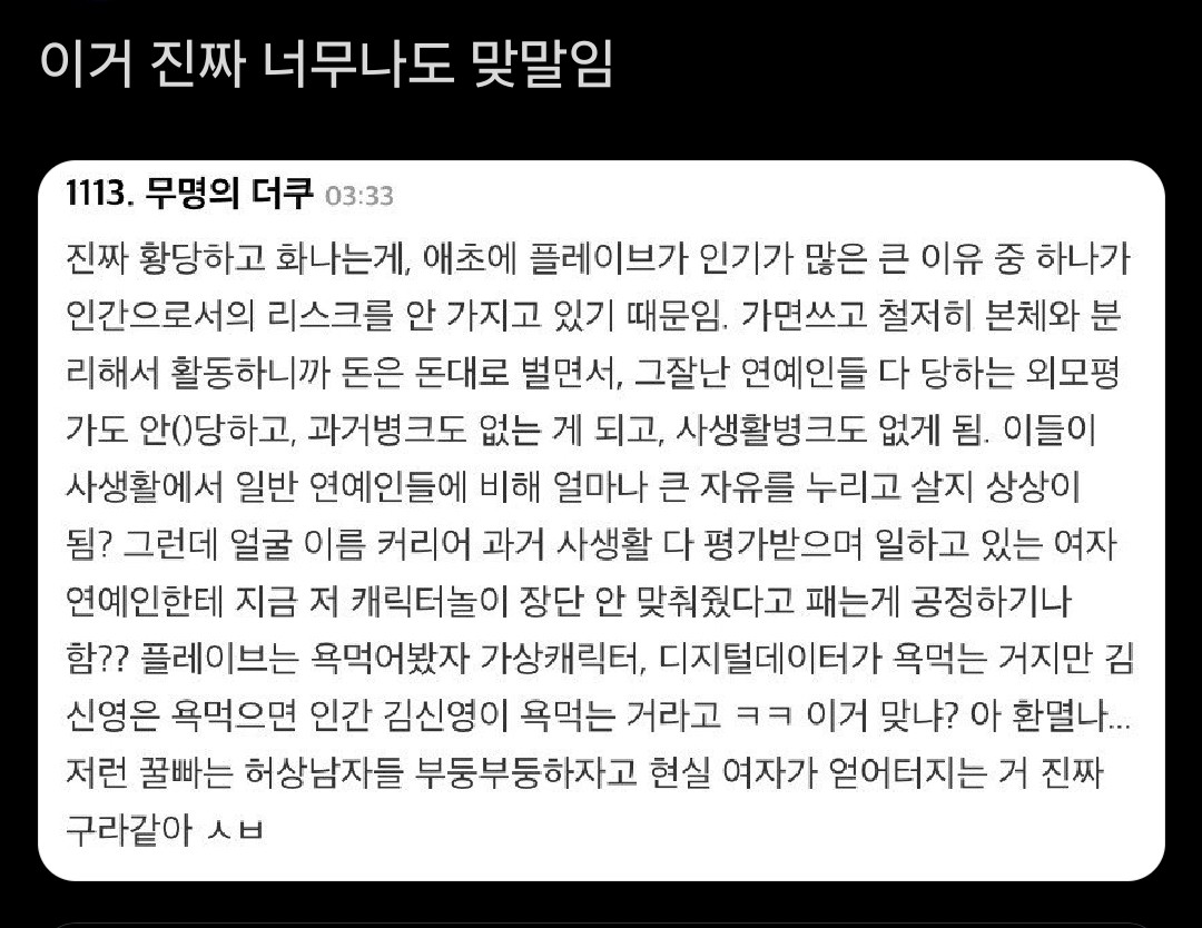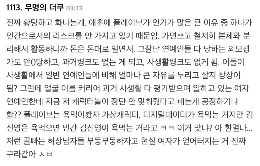 몇몇 플리가 이상한건데 플리 전체로 확대해 보거나 플레이브 자체를 심하게 비하하는 애들이랑 얼굴관리도 안 한다며 버츄얼을 비하하는 애들한테 한 말이야. 네 글을 뭐라 한 게 아니라. 애초에 이세돌이랑 플레이브는 차이가 있잖아.. 이세돌은 주로 트위치에서 활동하는데 플레이브는 버츄얼이면서 타 아이돌처럼 활동하니 꼴보기 싫다, 주제 모른다고 얘기가 나와서 적어본 거었어. 버츄얼이 대중화 되는 게 플레이브가 거의 처음이라는 말도 그것 때문에 한 거고..