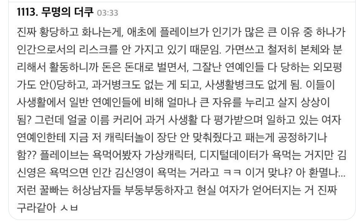 플레이브 자체로도 난 비호던데.. 그냥 버츄얼판에서만 놀면 좋겠음 이세돌은 욕 안먹고 플레이브는 욕 먹는 이유가 있는거임.. 예능 나오고 음방 나오는거 솔직히 아직 거부감 들기도 하고 챌린지 찍는거도 솔직히 난 내가 파는 아이돌하고는 안찍었으면 좋겠더라 그리고 결정적으로 팬들이 너무 극성임.. 진짜 사소한거라도 지들 맘에 안들면 엄청 난리 침 정 완전 떨어져..팬들만 아니었어도 이해는 해보려했을텐데 팬들 때문에 정이 다 떨어져서 이해하려는 시도조차 안하고싶음