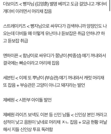 제발 음지는 음지에서만 놀아라 다른 아이돌들이랑 시상식 하더라도 상 따로 주던가 아니면 버츄얼 시상식 지들끼리 열던가 플레이브 가사 논란 있는데 그걸 보고도 빨아주고 다른 아이돌들 욕하는 팬들 수준 참