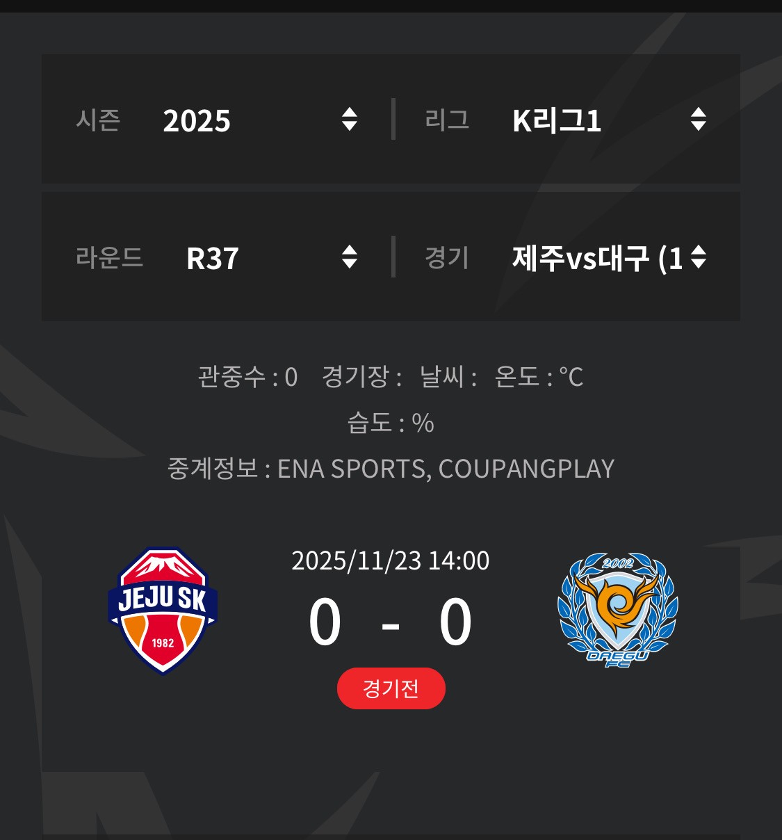 2025.11.23.(일)K리그1 제주VS대구여기서 지는 팀은 무조건 강등글쓴이는 전북임(경기후)무승부는 예상 못했네..